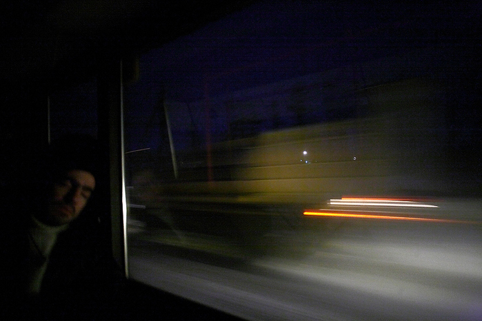 Владимир спит в автобусе по дороге домой с работы.