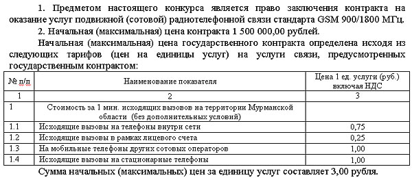 Два конкурса на «оказание услуг подвижной (сотовой) радиотелефонной связи стандарта GSM 900/1800 МГц»: на полтора миллиона(для 74-х номеров правительства) и на 600 тысяч (для 42-х симок облдумы). Или ежемесячно 2500 и 1400руб. на номер соответственно.