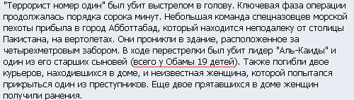 У нас в информационной службе вчера тоже добрая половина сотрудников пыталась поменять Обаму и Усаму местами. С одной стороны, на удивление созвучные имена, с другой — герои одной и той же новости, с третьей — повсеместный ажиотаж и лёгкая неразбериха. Поэтому в ньюсруме постоянно было слышно что-то типа «Аль-Каида подтвердила смерть Обамы» или «Обама уже похоронен на дне Аравийского моря» (отсюда)