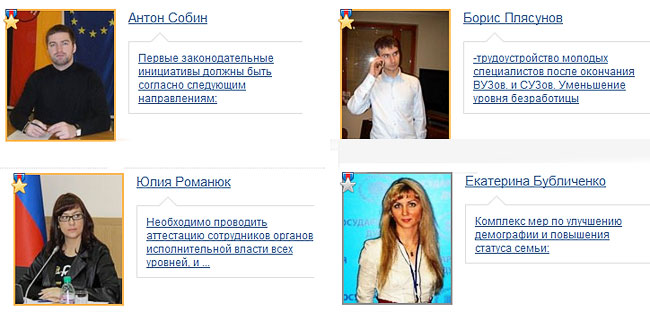 На сайте молодежных праймериз ЕдРа вывесили победителей. Зацените придумку — финалистов обозначили виртуальными медальками: желтыми, типа под золото, и серебряными — для второсортных победителей. Хуемерки в лучших традициях сайта «одноглазнеги»: