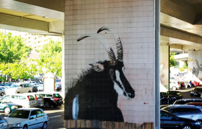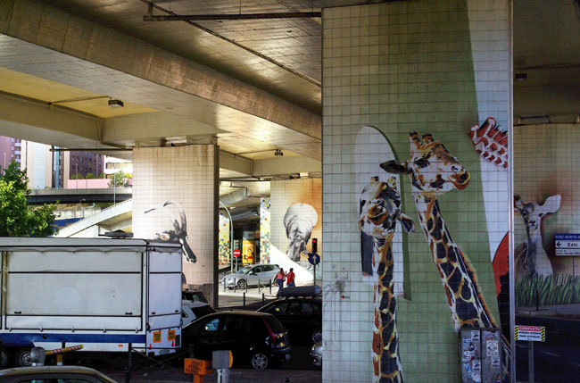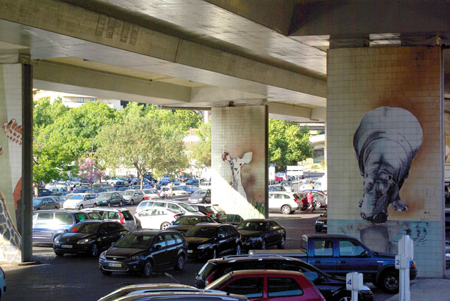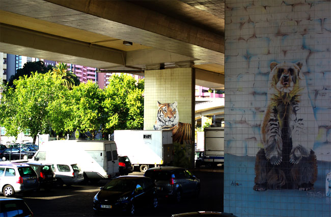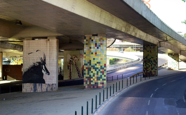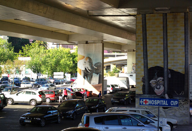 Несколько карточек, снятых из автобуса, катающего туристов по Лиссабону. Маршрут проходит под транспортной развязкой, но вместо унылых бетонных опор жители и гости города видят изображения животных: