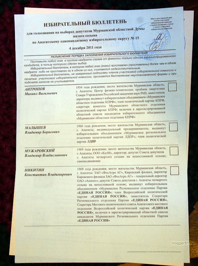 Пошёл сегодня на избирательный участок узнать есть ли на участки списки кандидатов в депутаты в область и в Москву. Мне там показали фигу да ещё и с маком!!! Нет там не списков ни фото морд будущих защитников народа. Спросил а почему это нет, осталось всего неделя до выборов? Ответ простой и точный -ТИК не прислал ещё. Звоню в ТИК, тот же вопрос, ответ получаю полный. Списки увидите в день голосования, а сейчас можете их посмотреть в СМИ (инет, газета, радио и телик). Я не встречал за свою жизнь такого блядства!!! При СССР такого не было, я знал в конце концов за кого голосую за ранее (нравятся они мне или нет) Скоро Мы как избиратели совсем не нужны будем. Придумают голосовать по почте в виде телеграм или по телефону в виде факса. А может просто в виде телеыонограм. «Передал-Иванов» » Приняла Петрова»