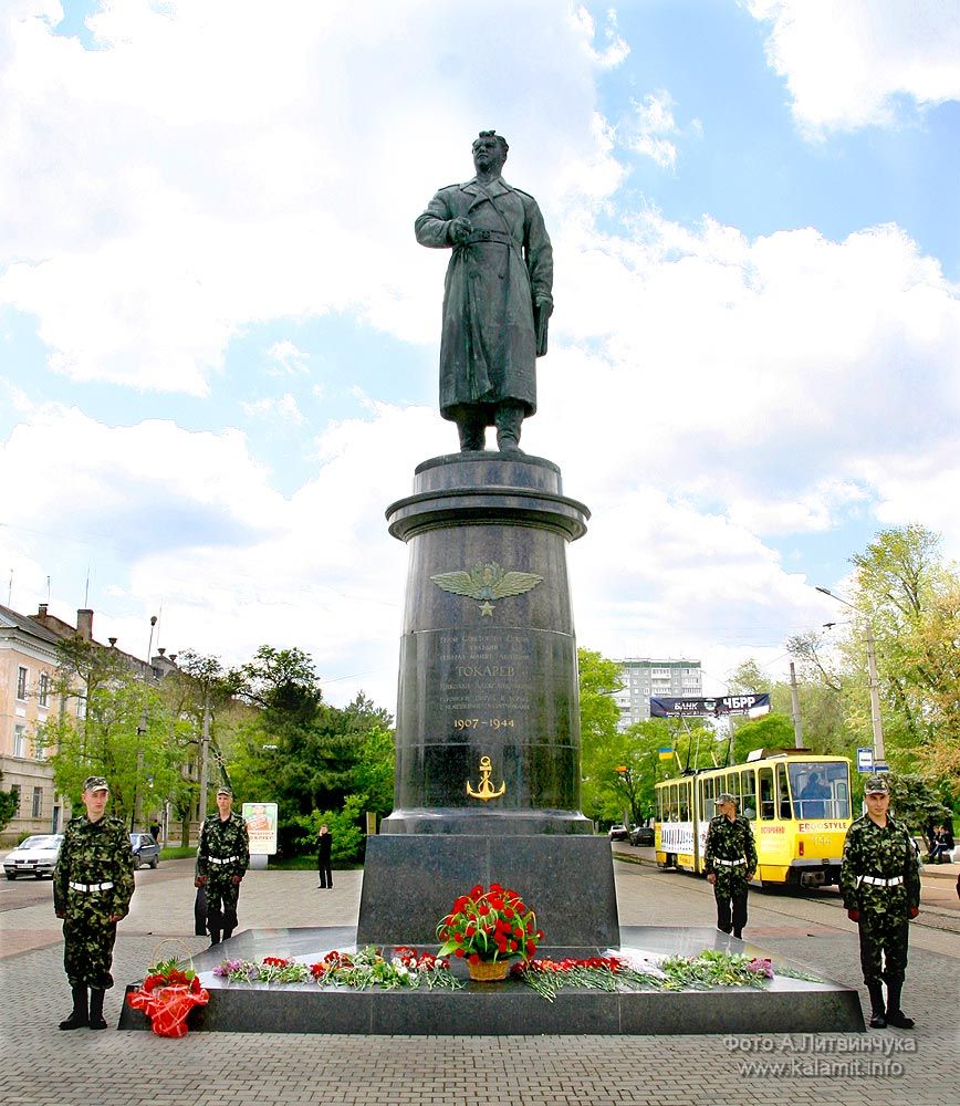 В Евпатории в центре города на площади стоит величественный памятник генералу авиации Н.А.Токареву, на 6 метровом постаменте из черного лабрадорита бронзовая фигура летчика, достопримечательность города. http://reibert.info/forum/attachment.php?attachmentid=506799&d=1275645676