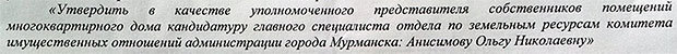б) В качестве представителя дома жильцам предлагают выбрать сотрудницу городской администрации из комитета имущественных отношений Ольгу Анисимову: