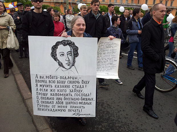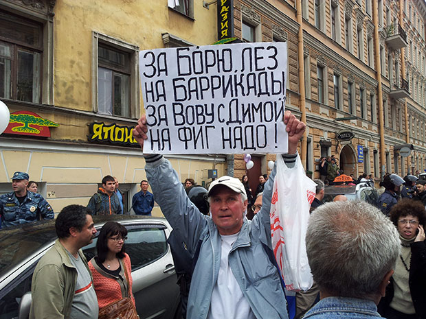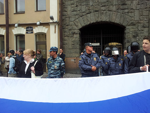 Были опасения, что в связи с новым законом о митингах будет массовое задержалово — но нет, обошлось. Правда, долго шли до места митинга и выбились из заявленного графика — по приходу на Конюшенную площадь организаторов забрали в полицию. Ну еще нацики с ЛГБТ-активистами подрались чутка.