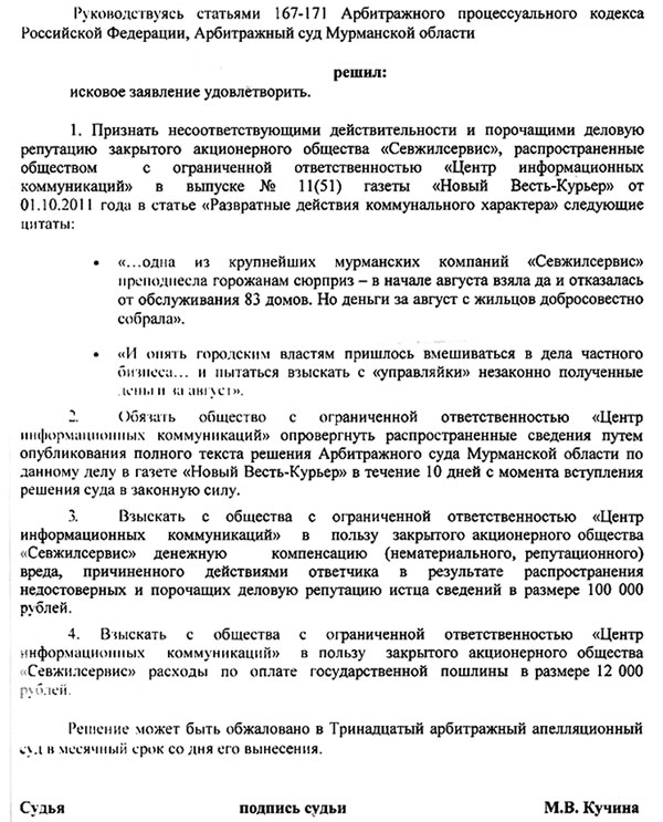 Продолжаем ЖКХшный понедельник на уютном бложике. В слухоприемник упало апрельское решение областного суда, который удовлетворил иск управляющей компании «Севжилсервис» к газете «Новый вест курьер», лишний раз отметив самую суть издания (унылое говнометание, если кто не знал)