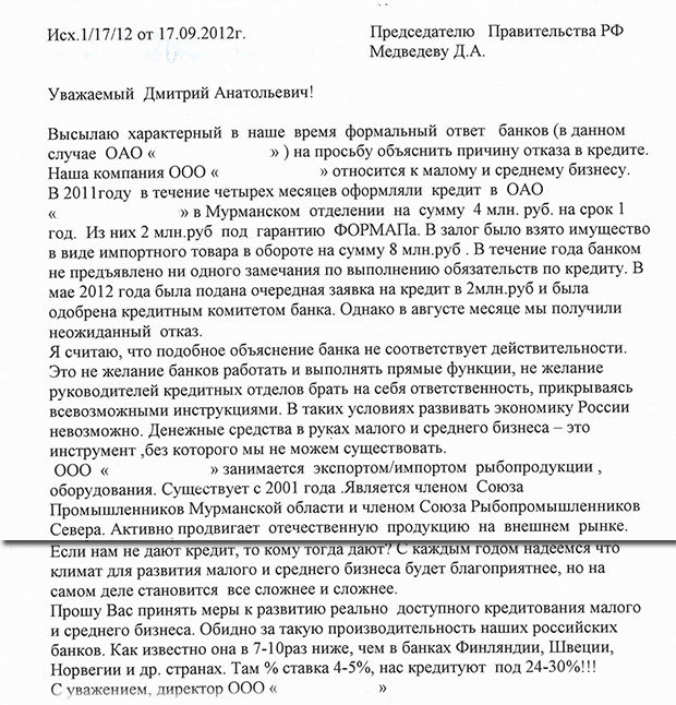 В почту через третьи руки дошло обращение одного из мурманских бизнесменов, направленное председателю Правительства Дмитрию Медведеву. Заявитель сообщает о немотивированных, на его взгляд, отказах в выдаче кредитов малому и среднему бизнесу в Мурманской области: