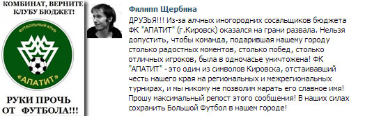 ОАО Апатит с этого года решительно сократил расходы на содержание своей футбольной команды «Апатит», последние годы становившейся призером Северо-Запада среди команд третьего дивизиона.