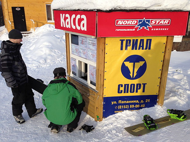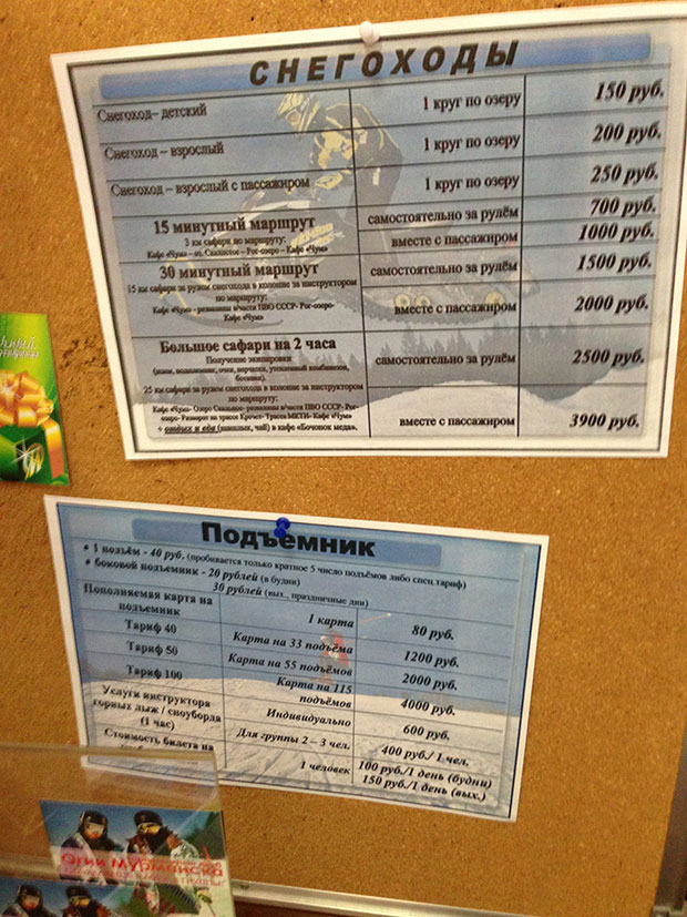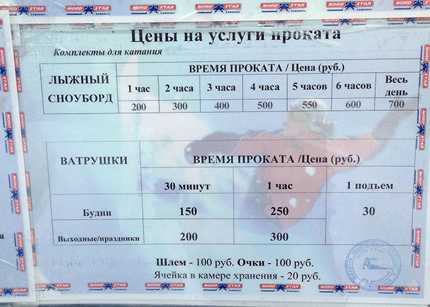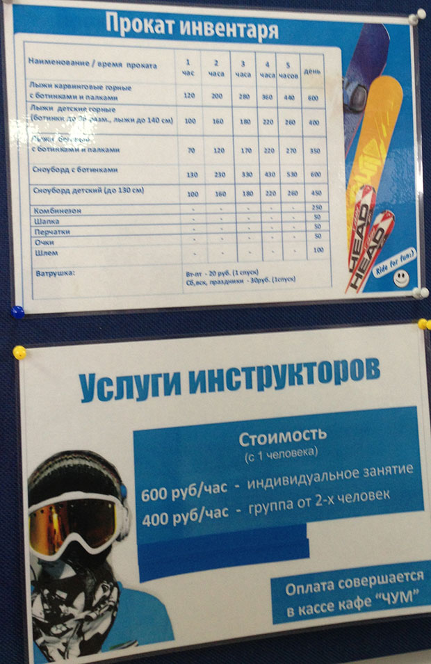 Разовый подъем на подъемнике обойдется в сорок рублей. Аренда горнолыжного оборудования (палки, лыжи, ботинки) обойдется в 120 руб/час или 600 рублей в сутки. Аренда полного комплекта одежды обойдется в 500 рублей. На мой взгляд, очень удобно — необязательно искать по знакомым лыжный комбинезон и можно приезжать налегке.