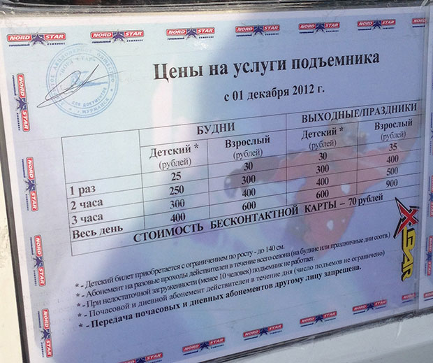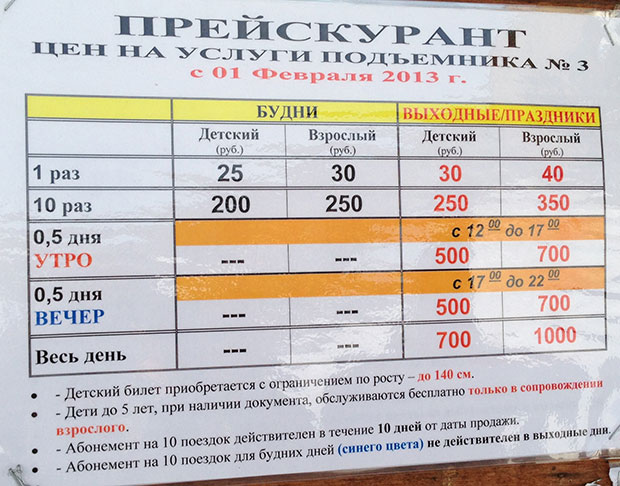 Разовый подъем стоит 30 рублей в будни и 35 по выходным и праздникам: