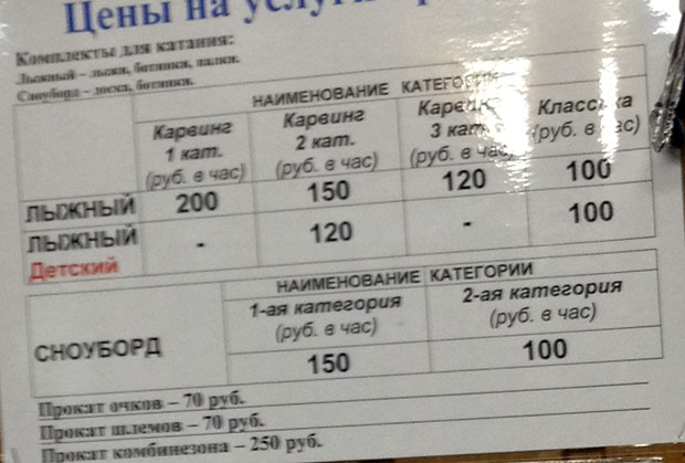 Прокат оборудования от двухсот рублей за час. Арендовать одежду нельзя