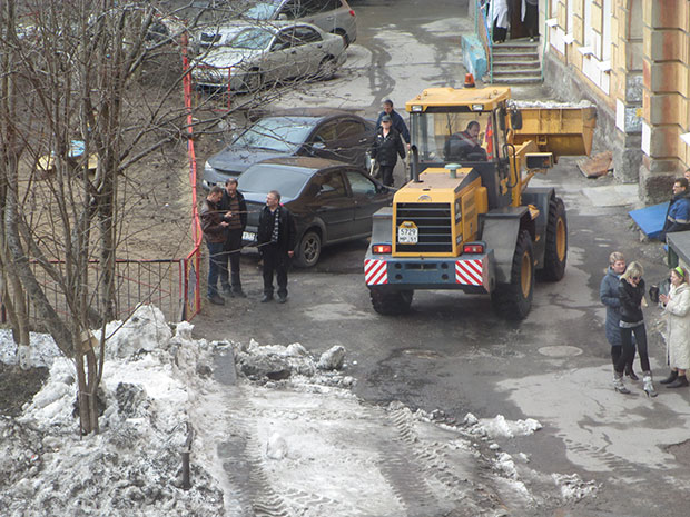 24-га апреля во дворе дома по адресу Рыбный проезд, 4, работала комиссия по уборке снега, на глазах которой погрузчик хорошо помял ограждение зеленой зоны: