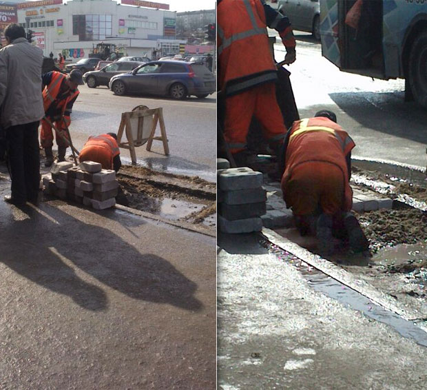 Господа дорожники! Бесплатно отдаю идею. Пока никто не догадался запатентовать «Кирпичный способ ремонта дорог». Торопитесь. А то опять иностранцы скоммуниздят прекрасную идею.