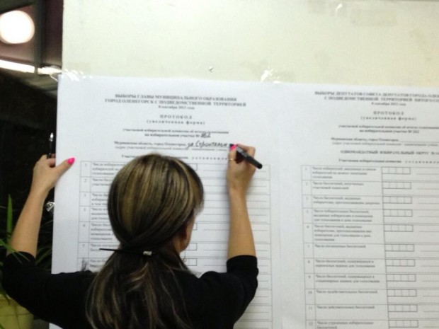 Как пишет со своего оленегорского избирательного участка председатель ОО «Открытый город» Константин Главатских, явка за час до окончания голосования не превышала 20 процентов. На момент подсчета отрыв между кандидатами в мэры города составляет 2-3 голоса