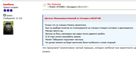 В Никеле в результате беспропудного пьянства персонала и вопиющего непрофессионализма произошло лобовое столкновение несущихся со скоростью 120 км/ч составов. Один состав (локомотив и двенадцать вагонов) перевозил репрессированных кровавым режимом участников мирной демонстрации на Болотной и прочих противников ПЖиВ, незаконно осуждённых к принудительным работам на объектах КГМК, в сопровождении вооружённой охраны. Второй состав (два локомотива и 60 вагонов) перевозил радиационные материалы, серную кислоту и прочую красную ртуть. В итоге случилось кроваво-металлическое месиво, две сотни неопознанных трупов, полнейшая экологическая и экономическая катастрофа всего Печенского района и его окрестностей в радиусе 300 км. Вся эта трагедия нагло замалчивается МЧС и прочими представителями кровавого режима. А мы все уже поумирали нафиг, но об этом пока не догадываемся