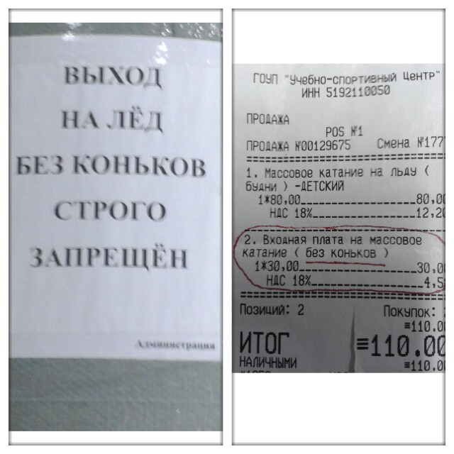 В блоггерскую почту (blogger.murmansk@gmail.com) прислали жалобу на взимание денег за выход на лед без коньков в Ледовом дворце Мурманска. Вручаемый получателю услуги чек в паре с запрещающим объявлением выглядит вообще шизофренично: