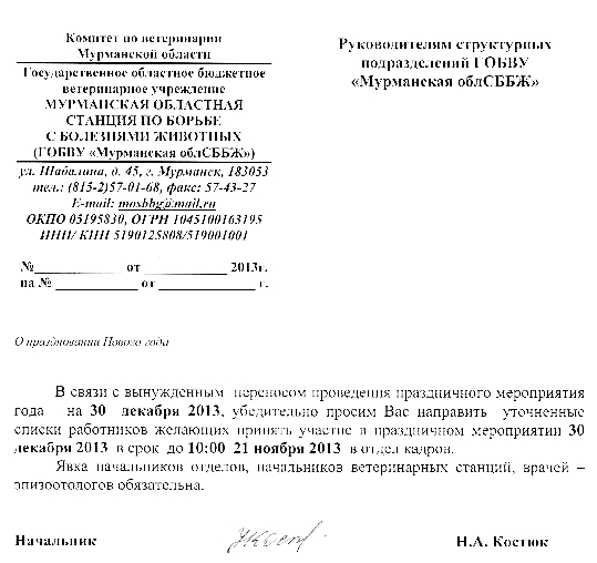 В соответствии с документом, явка руководителей среднего звена и врачей-эпизоотологов обязательна. Как сообщают в почту blogger.murmansk@gmail.com, праздничный взнос определен по три тысячи рублей с человека, явка участников с мест (в т.ч. из Умбы, Ковдора, Никеля) обязательна:
