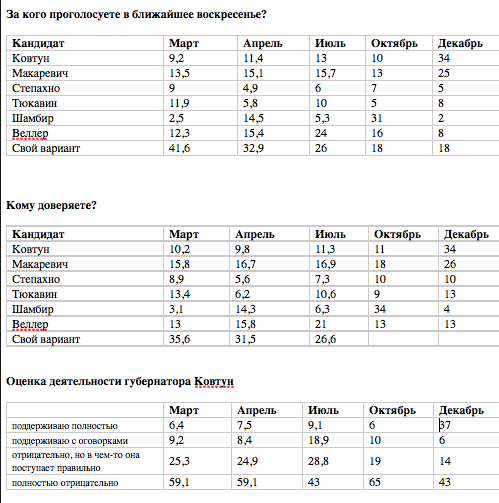 Кандидат «свой вариант», который включает в себя львиную долю протестных голосов, до последнего времени держал лидерство в вопросе «За кого вы проголосуете в ближайшее воскресенье?». А предложенные кандидаты смогли показать максимальный рейтинг в 34% (Ковтун в декабре) и то с известными допущениями, о которых ниже.