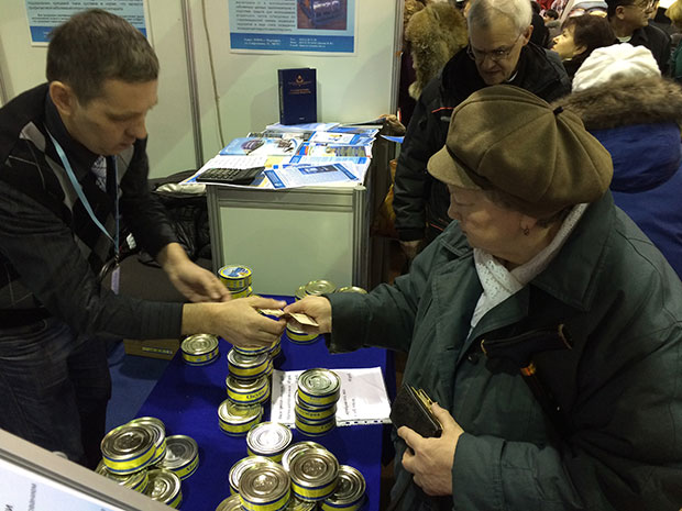 Выставка объединила два противоположных мира. С одной стороны — коммерсанты, и здесь же оказалось большое число пожилых людей, пришедших подешевле купить рыбных консервов: