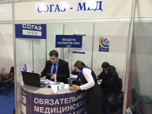 У стенда страховой компании «Согаз-мед» можно легко и быстро заменить ваш бумажный полис ОМС на пластиковый:
