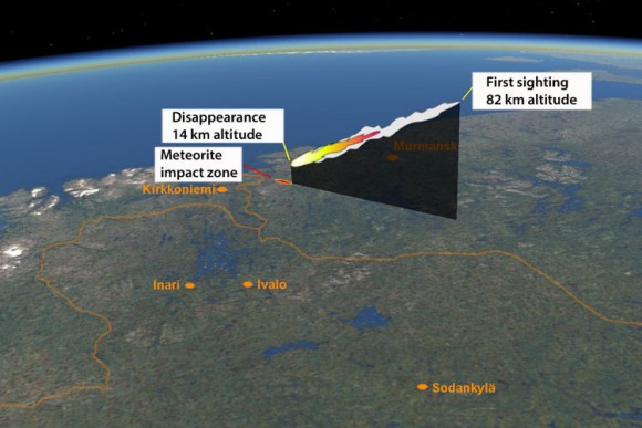 Учёный Esko Lyytinen с помощью Jarmo Moilanen и Steinar Midtskogen воссоздал траекторию полёта метеороита на основании снимков, видео и показаний очевидцев.