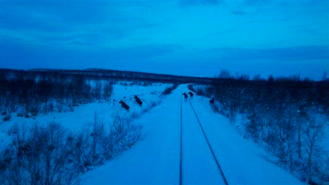 Семейство лосей перебегает железнодорожные пути на участке Кола-Луостари