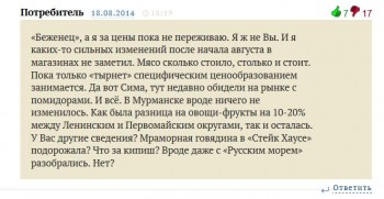 На этой неделе представители всех торговых сетей Мурманска побывали в районных прокуратурах. Там торговцам вручают предостережения о недопущении роста розничных цен более, чем на тридцать процентов в месяц (копии предостережений имеются в распоряжении bloger51), а также настойчиво призывают писать жалобы на поставщиков, повышающих цены.