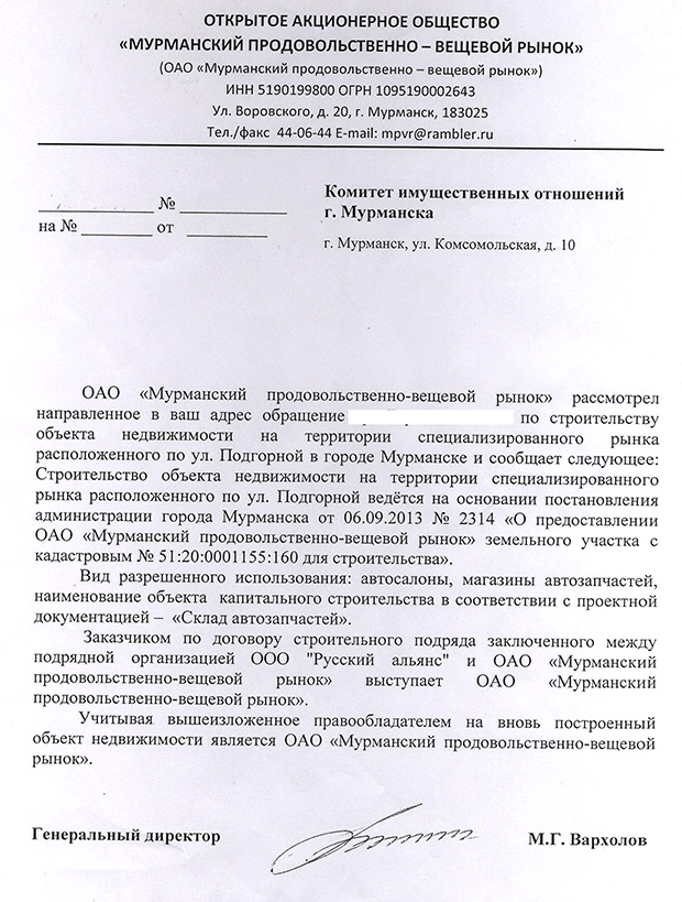 Как взаимоувязаны интересы населения города Мурманска (100% акций ОАО «Мурманский продовольственно-вещевой рынок» принадлежит администрации города Мурманска) с интересами инвесторов осталось за рамками обсуждения.