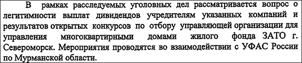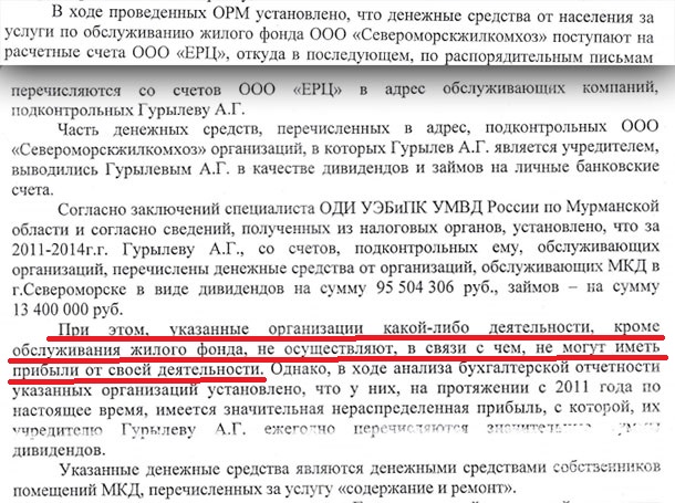 Четырнадцатая страница: вопрос о судьеб уголовного дела в отношении владельцев североморской управляйки «Североморскжилкомхоз«, то бишь речь идет о господине Гурылеве. Управляйка выдала дивидендов на 95 миллионов рублей(!) и еще 13,4 — займов
