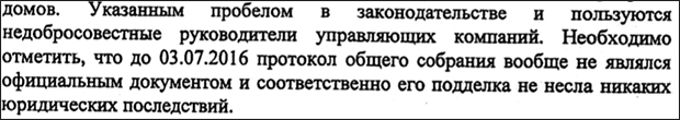 Смешные отмазки насчет отсутствия состава за подделку протоколов общих собраний просто нелепы. И отсутствие результатов при проверке УК тоже никого уже давно не удивляет. Да и не проверят их никто.