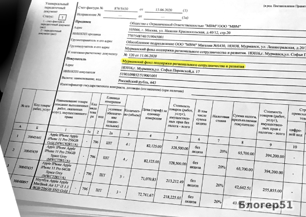 Вот обычный на первый взгляд счёт-фактура на покупку одиннадцати айфонов последней модели (из них четыре в золотом цвете) и трёх «яблочных» же ноутбуков, также в золоте. Дата — 13 июня: