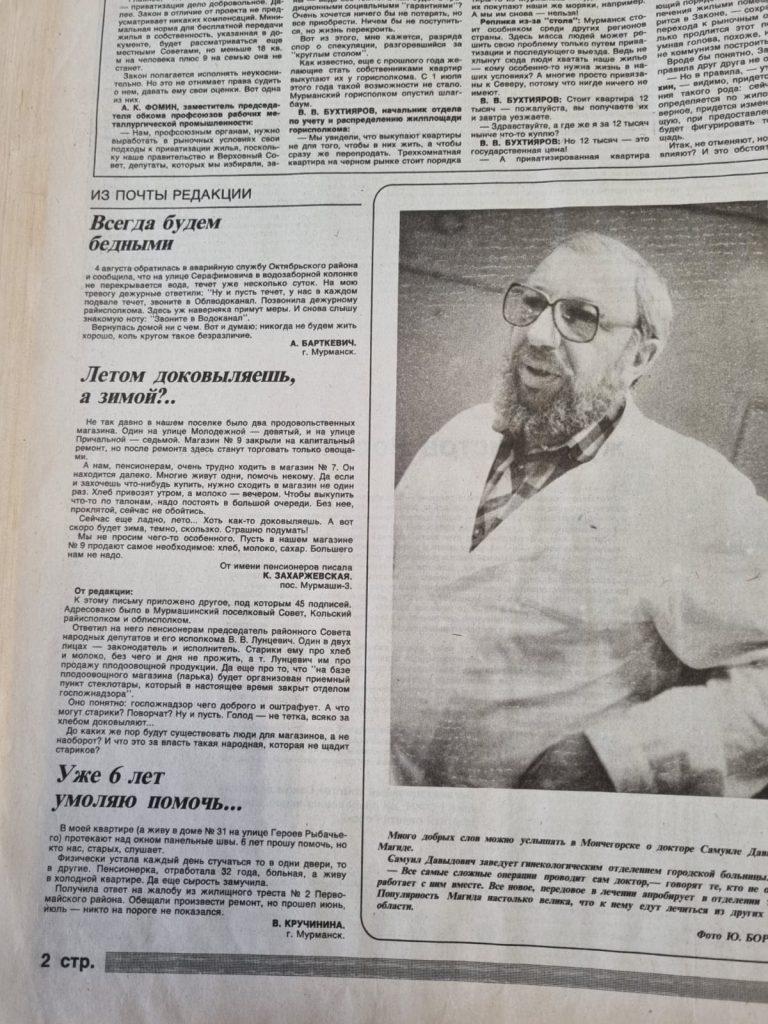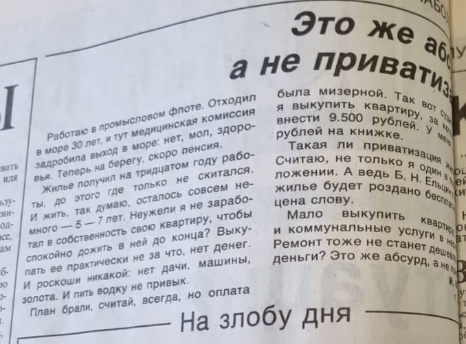Вот интересный фрагмент: жалобы населения на текущие трубы, закрытие продмага и на состояние дома — протекают межпанельные швы. К сожалению, в фото целиком не попал куда более интересный материал — про приватизацию жилья: