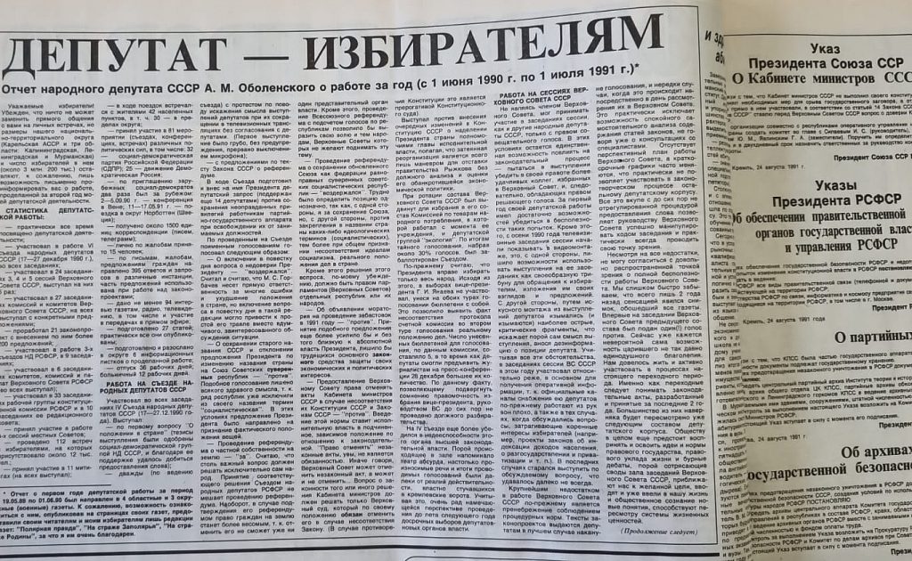 А вот некий депутат Оболенский на полполосы отчитывается перед избирателями о своей июньской деятельности. На дворе, напомню, конец августа, поэтому содержание отчета примерно такое, что он еще в июне лично приближал наступление демократии: