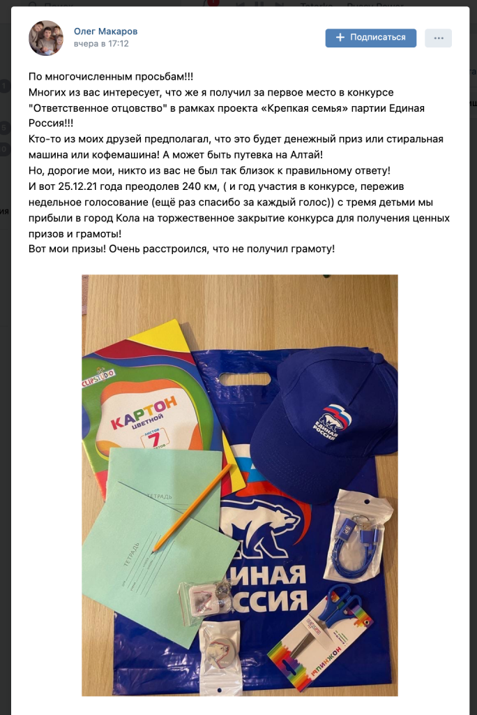 Вот тут финалист конкурса «Ответственное отцовство» проекта «Крепкая семья» партии Единая Россия делится призом за первое место.