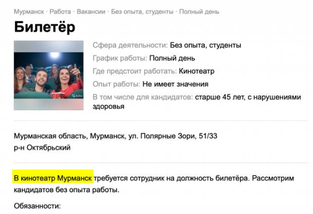 Рассмотрим на примере вакансии билетёра в кинотеатре Мурманск за 57k в месяц: