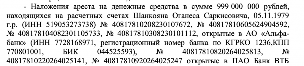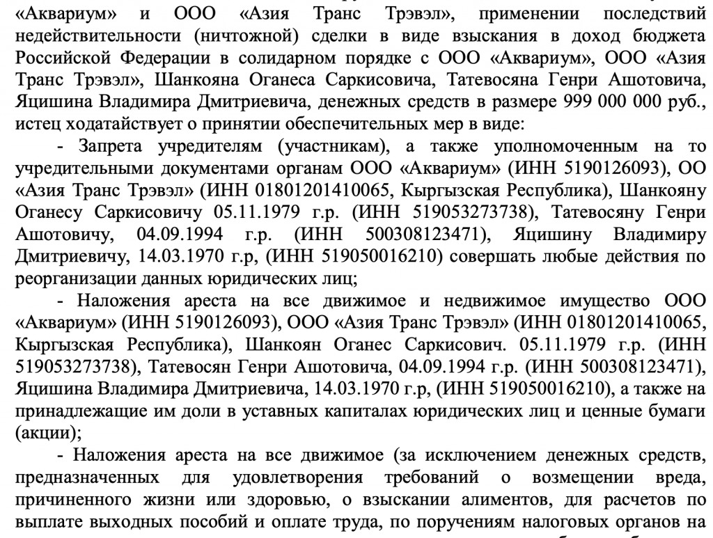А запреты реально лютые. По мнению истца, аресты имущества, активов и запрет на их продажу/отчуждение/реорганизацию должны быть наложены как на юрлица, так и на трёх физлиц: на Оганеса Шанкояна, на Генри Татевосяна (помните ремонт крыши на Ленина, 67?) и на Владимира Яцишина. Каждому грозит арест всех счетов на 999 миллионов рублей на период дела. Каждому, а не на всех.