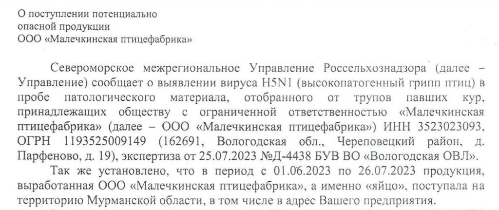 Местный Россельхознадзор (не путать с роспотребнадзором) сообщает о птичьем гриппе на вологодской птицефабрике, поставлявшей курятину и яйца в Мурманскую область, в том числе на пищевые производства: