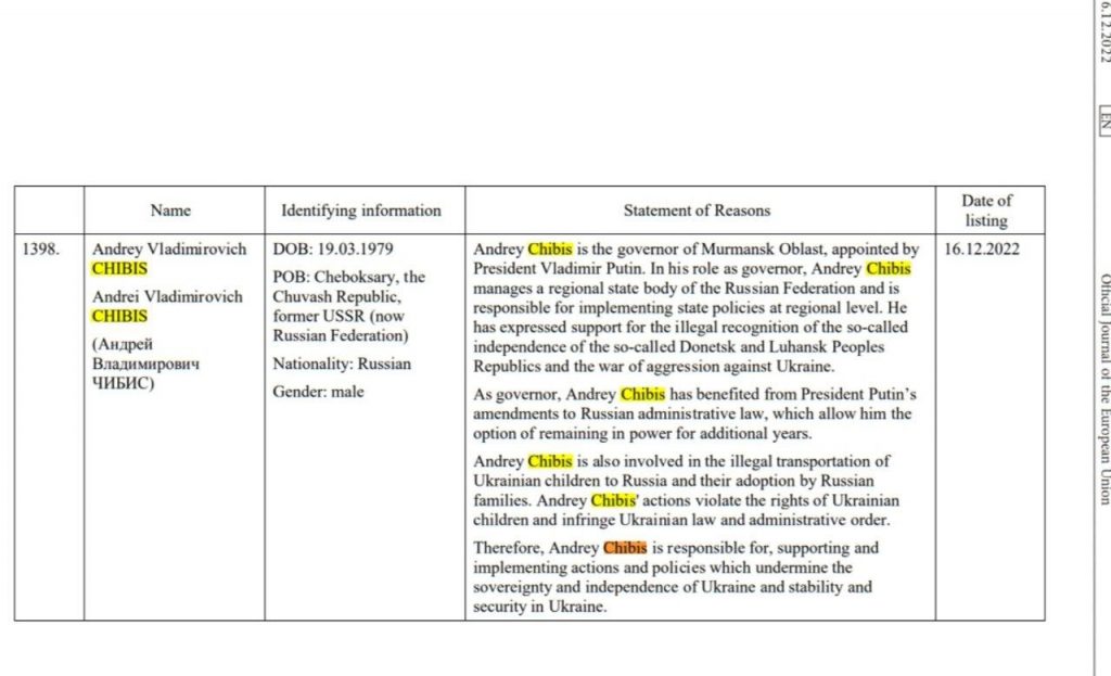 Губернатор Чибис оказался в очередном санкционном пакете Евросоюза. Основания — то, что он губернатор и реализует государственную политику на региональном уровне. Также ему вменили «транспортировку украинских детей в Россию», у нас это называлось эвакуацией: