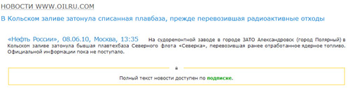 Знакомьтесь, это сайт журнала «Нефть России». «Информационный портал», как они себя называют, 8 июня разместил новость с заголовком «В Кольском заливе затонула списанная плавбаза, прежде перевозившая радиоактивные отходы».