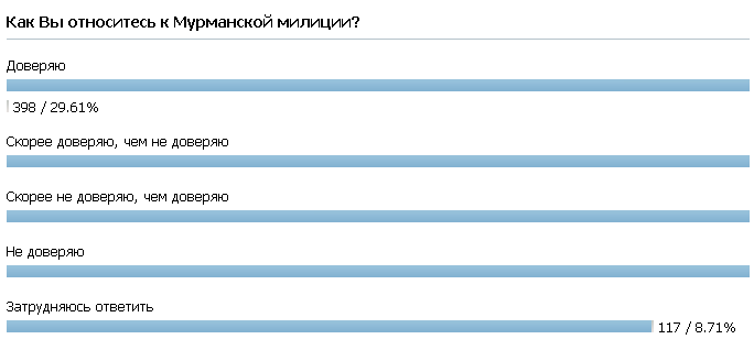 На сайте УВД Мурманской области висит опрос: «Как Вы относитесь к Мурманской милиции?» с пятью вариантами ответов. А вот доступные результаты голосования: