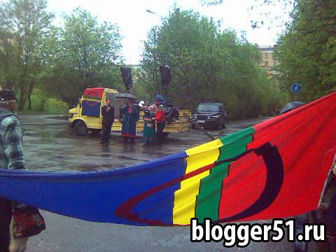 В 14 часов возле «кировки» под флажком Саамской организации начался пикет в защиту неунывающего Валерия Страхова. Сам Страхов, правда, не выступал, много курил и бросал окурки на асфальт (а это, кстати, административка :-)